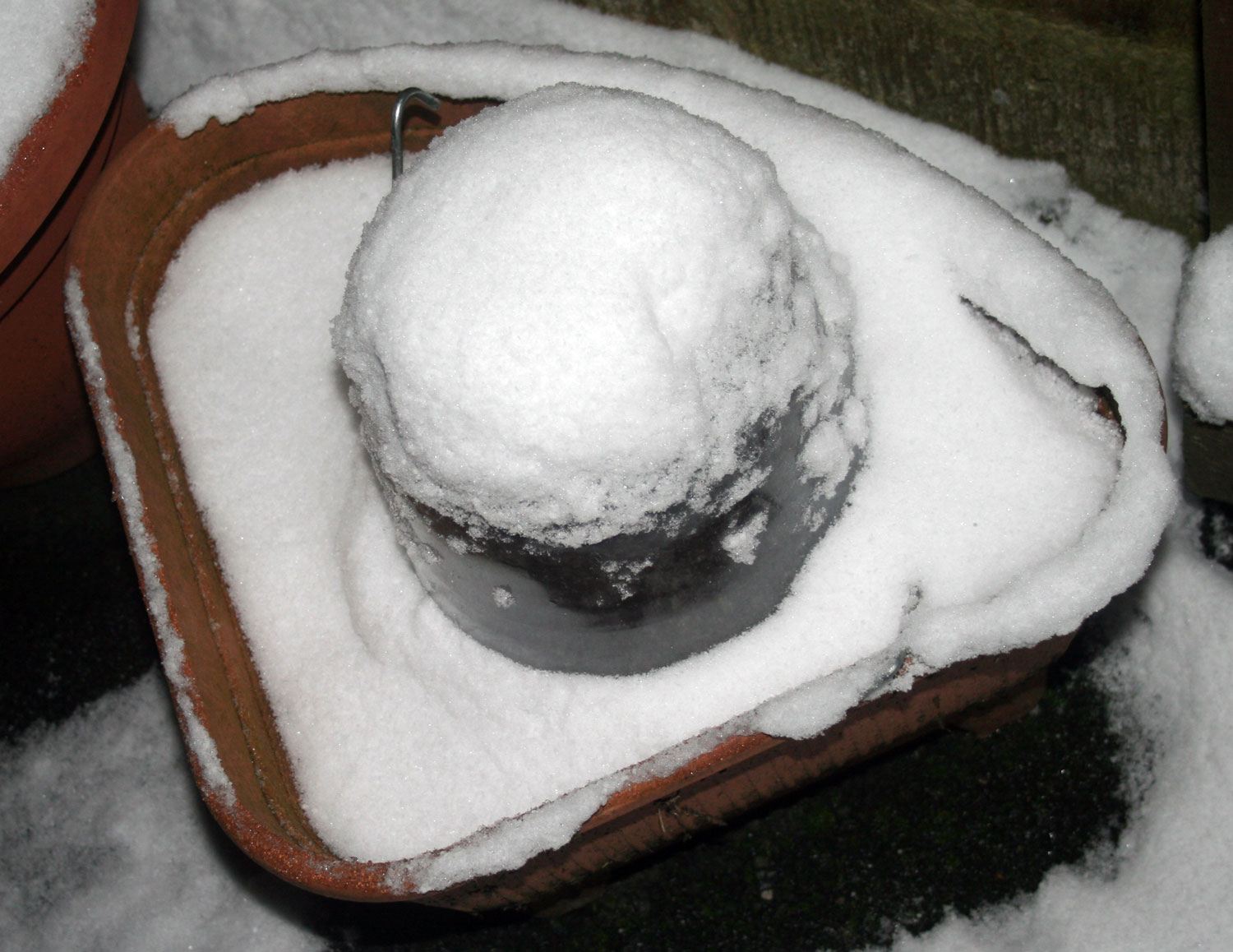 The mint, still looking slightly lop-sided but better than it was. Again sitting on a 50p plate from next door and yes, on the bin in the background you can see our light dusting of snow.